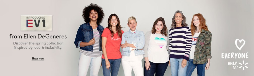 The Walmart collections keep pouring in, don’t they? Media Mogul, Ellen DeGeneres, has launched a line for everyone entitled EVI. The spring collection has launched has an array of casual, yet cute pieces. She offers casual tops, jeans, camo (lots of camo), shoes, and jackets. Of course, at Walmart’s affordable prices. Check out the collection below.