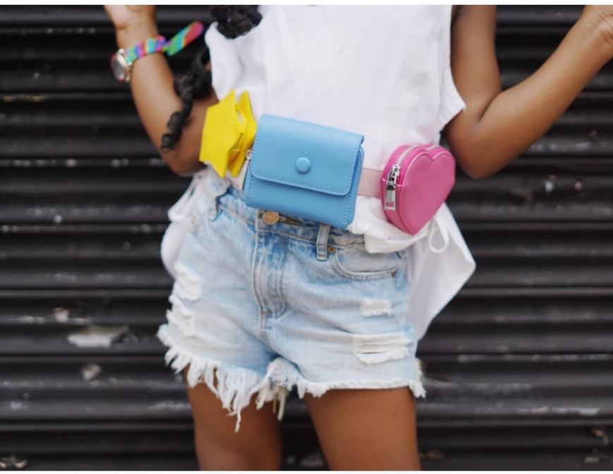 The belt bag is made of leather and features a middle blue zip pouch anchored by yellow star and pink heart shaped pouches. All three are removable which allows you to put them in the order of your choosing. It is available in children’s and adult sizes.