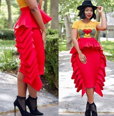 A statement skirt anchored by a graphic tee and statement hat.