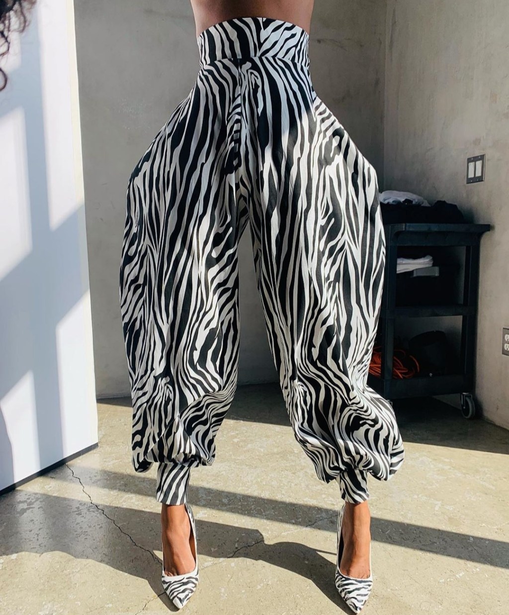 Want a stand out piece for fall? Then you’re at the right place. TLZ L’Femme’s highwaist zebra printed trouser plays on the current animal print trend but adds a twist in the shape of the pant. With a slim waist and exaggerated hip region, these pair well with body suit or drop top.