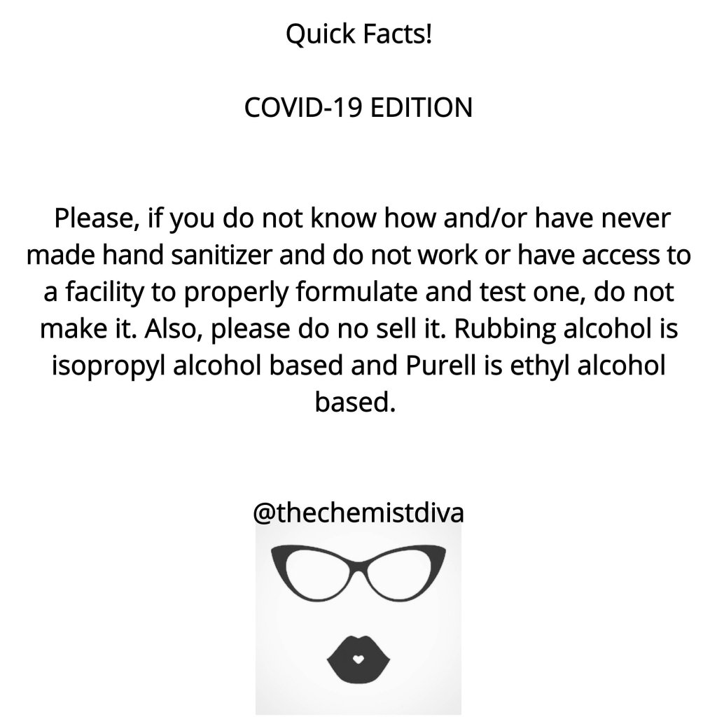 By now you’re likely aware of the COVID-19 pandemic and and the coverage it is getting. Whenever there is a state of emergency, there are those who take advantage and those who try to be resourceful. The resourcefulness can have negative effects in this situation. With readily made hand santizer flying off the shelves, many are posting and selling their homemade santizers. The most common ones suggest rubbing alcohol as a sanitizing agent. While it has its beneficial properties (which is why we use it on minor cuts), it does not contain the same type of alcohol as hand sanitizer. Read then post by The Chemist Diva to learn why you should not attempt your to make your own sanitizer.