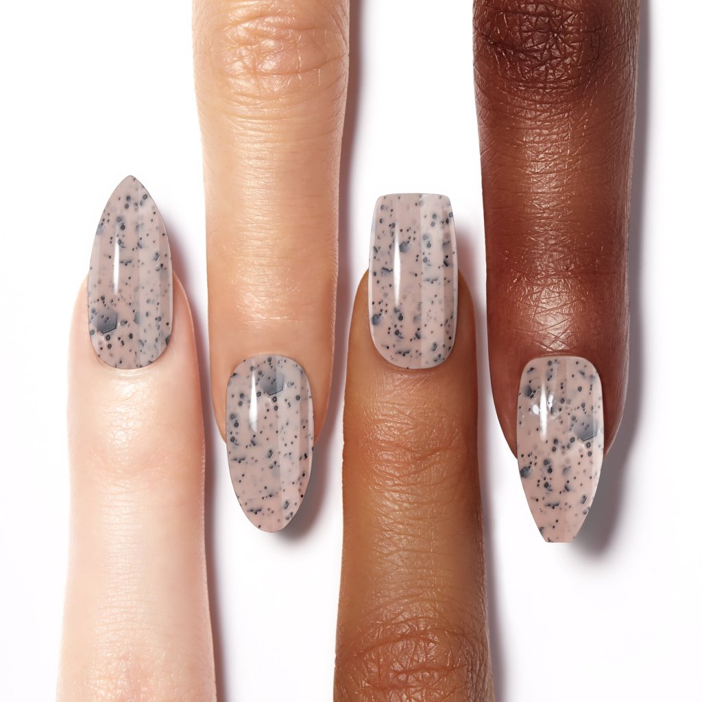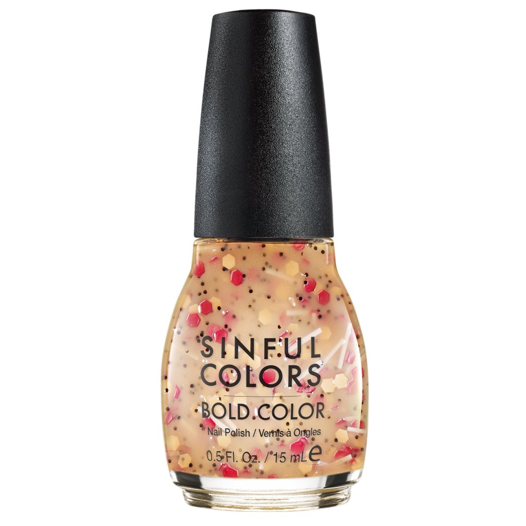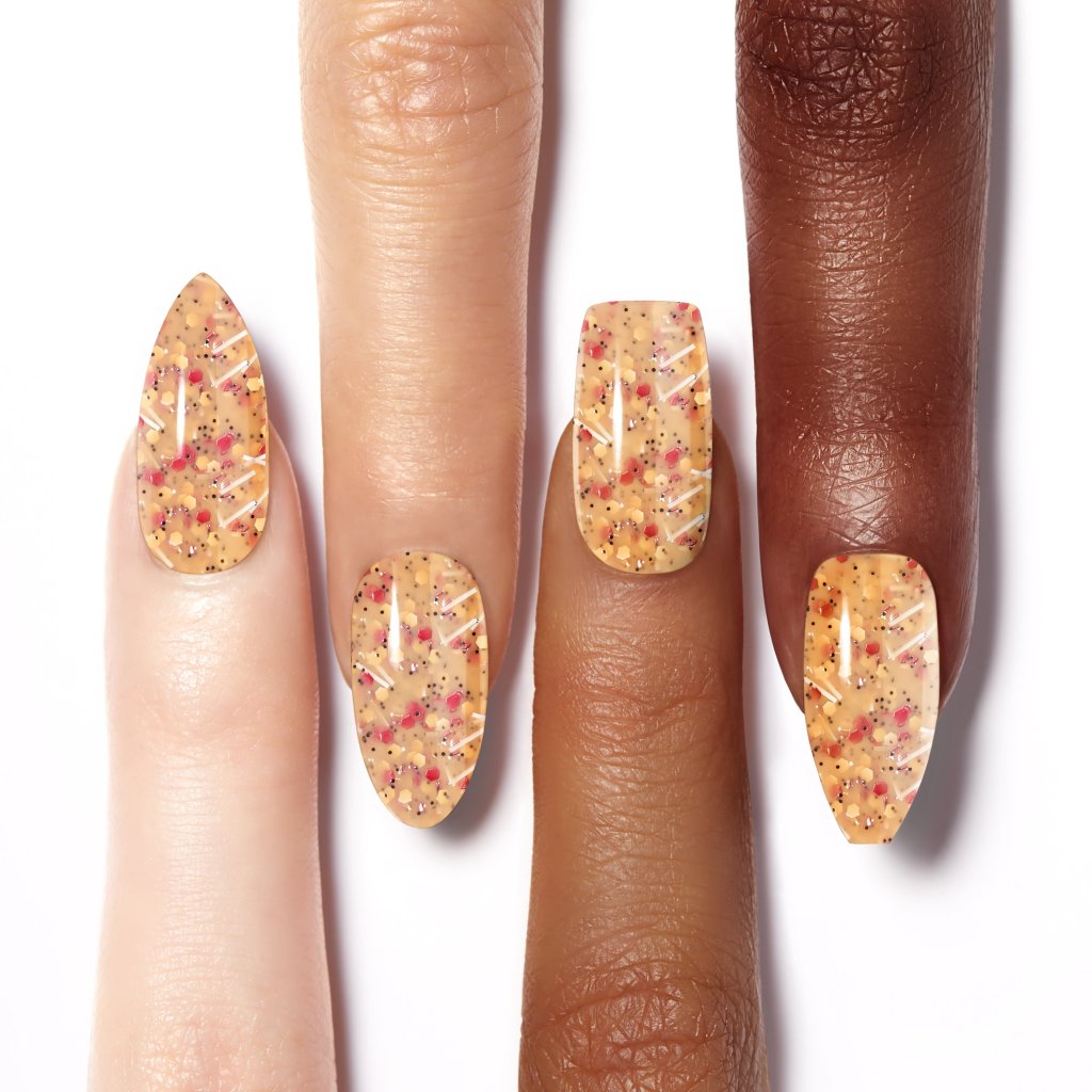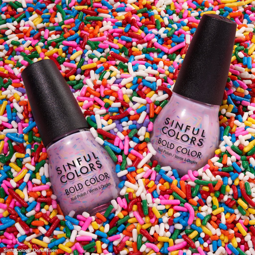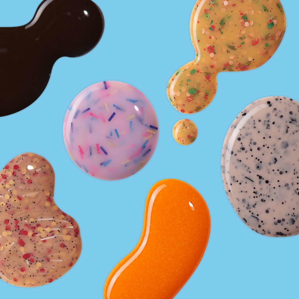 The polishes in the collection include Chocolate Cake (black with white speckles), Cookies & Cream (light brown with black glitters), Donut Even (milky lavender with sprinkle-shaped rainbow confetti), Pizza Party (yellow-brown with yellow, red, and black confetti), and Taco Tuesday (muted yellow with white, black, red, and green confetti. (Allure)
