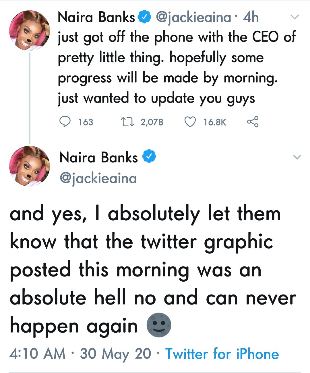 Influencer, Jackie Aina, is no stranger to advocating for black people and calling out brands for their lack of diversity and inclusion, especially in the beauty industry. In her latest Instagram Stories, she called out and tagged three brands: Revolve, Fashion Nova, and Pretty Little Thing. She cited those brands had a huge black customer base and used black culture and fashion aesthetics on their social media. She even accused them of using models that “blackfish.” A term coined for women who tan and use makeup and clothing appear black. She noted the importance of consuming black culture includes the good and the bad.So far only one of the aforementioned companies have reached out to Jackie.Update:05/30/20Jackie has announced she spoke with the CEO of Pretty Little Thing.