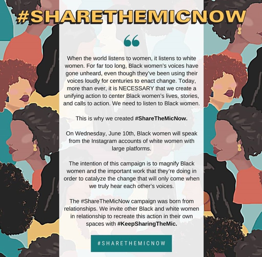 It is a campaign unlike any other. The Share Mic Now initiate aims to amplify the voices of black women across various industries and their stories by having them take over the accounts of notable white women. Because as the creators stated, “When the world listens to women, it listens to white women.” When women like Hilary Clinton, Katie Couric, and Julia Roberts create the space among their audience, it allows more people to see and hear black women talk about their stories. This is especially impactful during the current climate with so many non-black people asking what they can do. Something like #ShareTheMicNow is the answer.