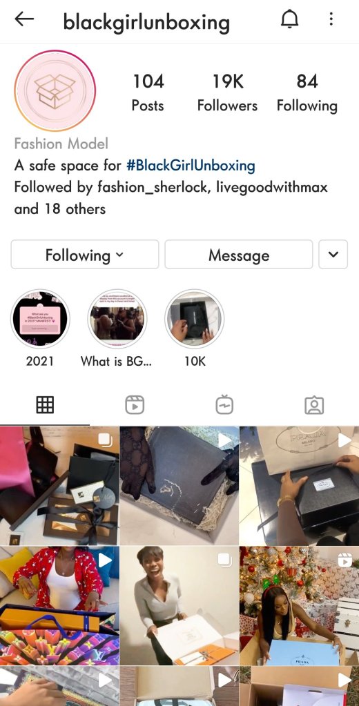 The account isn’t one specific person, per ser, but highlights the plethora of women showcasing their luxury goods. Black Girl Unboxing describes itself as “a safe place” which likely stems from the constant double standards and cruel comments Black women receive when showcasing luxury items. This treatment is based in racism and misogynoir. Black women are accused of having fakes (Though some women do have fake bags, not all do, nor are we the only race to carry fake bags), not having their finances in order, and/or having misplaced priorities when making their luxury public. Black Girl Unboxing aims to spread the message that black women deserve luxury too.