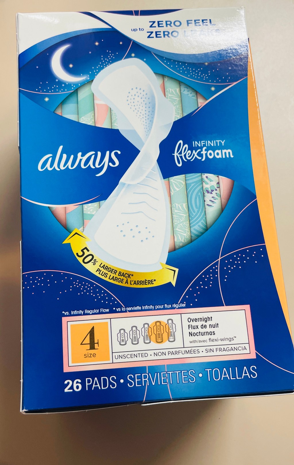 Always Infinity FlexFoam Overnight Absorbency pads feel like nothing and protect like nothing else. FlexFoam pads are unbelievably thin and flexible so your pad moves with you, not against you. Zero Feel protection is possible with form fitting grooves that conform to your shape, and super absorbent holes that pull wetness away from your skin. Always’ driest top layer is breathable, so you can say goodbye to hot and stuffy. With Always Infinity FlexFoam pads your period is the last thing on your mind. ( Always)