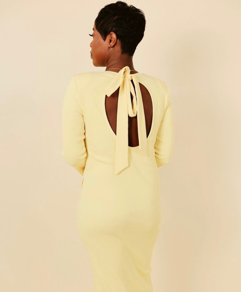 Staying true to her style aesthetic, the collection’s theme is elevate simplicity. There are two long sleeve midi dresses featuring slits and open backs. The lack of embellishments on the garments allow for the multi-functionality of the pieces. Wear with stilettos or sneakers and both will look fab.