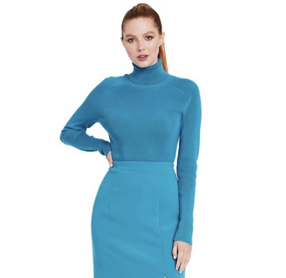 I love a colorful basic piece like this turquoise turtleneck. It can be worn casually or dressed up.