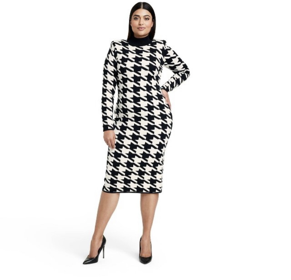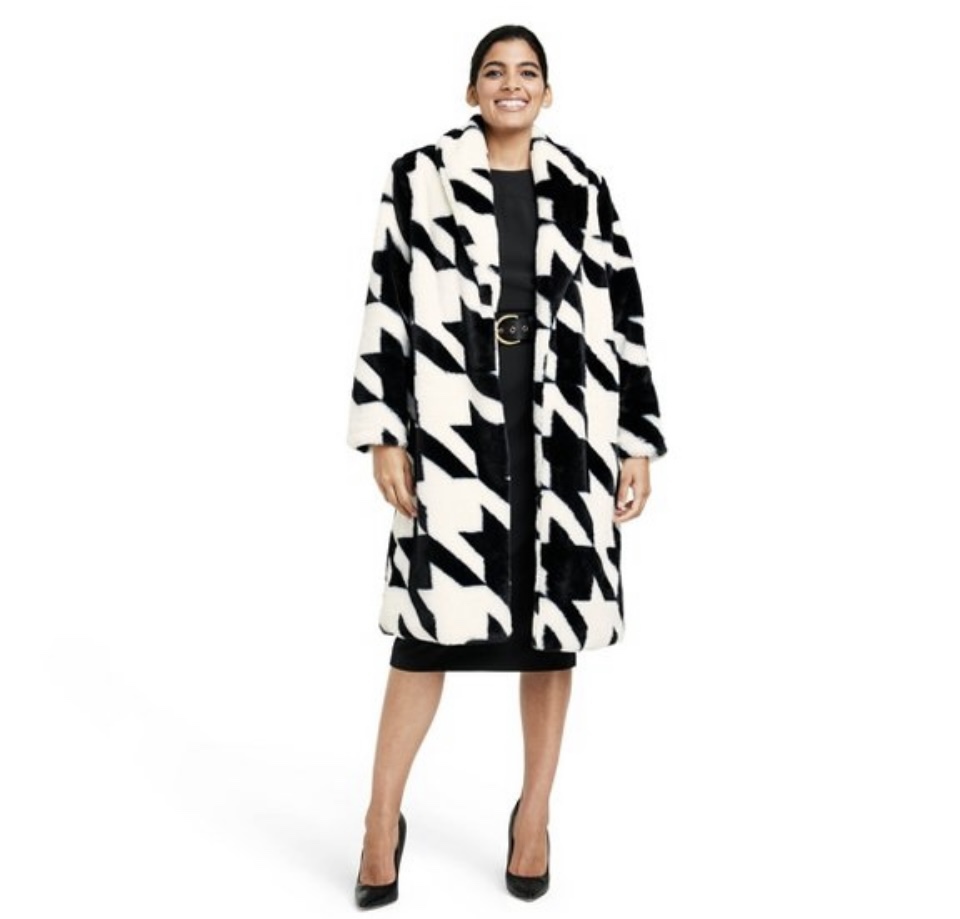 The large houndstooth printed coat is perfect as a statement in its in or to compliment a pop of color underneath.