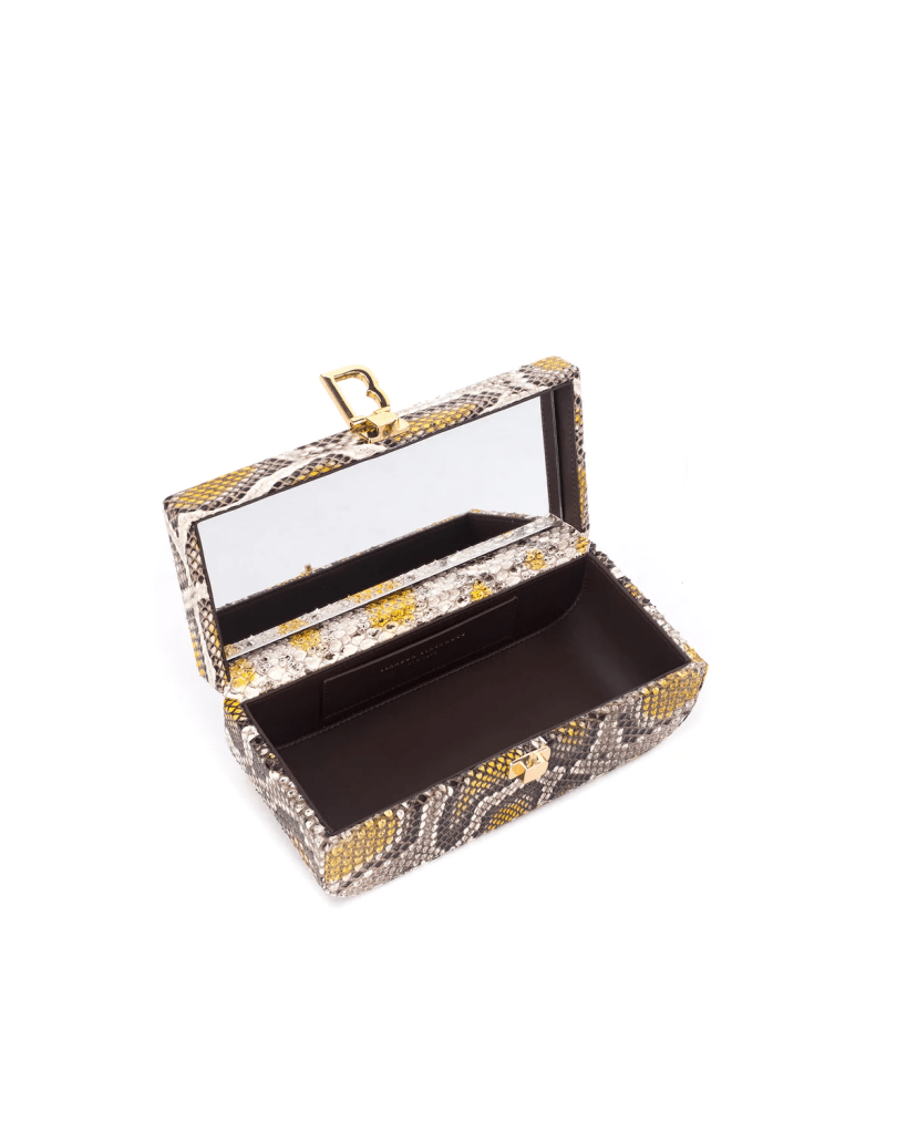 It was this bag that took my breath away. I had been looking for a box-like bag for a while and none were wowing me until the Vanity Purse hit my timeline. This version is made with python skin and 24K gold plated hardware. The black and brown leather versions are just as fabulous and retail for $350.
