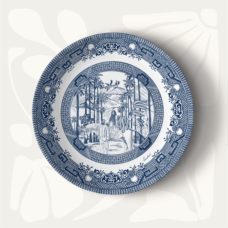 Description: The Marathon Blue dinner plate tells a story of romance and remembrance in South Central LA. Inspired by the visionary Nipsey Hussle and his unwavering dedication to his community and family, this design embodies the essence of his indelible spirit. Modern details include palm trees, mountains, a reimagined “Hollywood” sign, and California oranges woven into the border. We contrasted the modern imagery with the intricate blue willow pattern to create a beautiful blend of the past and present.
