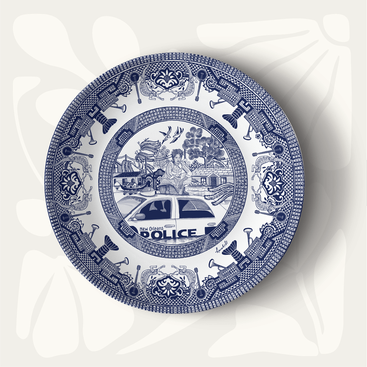 Description: The Blue Bayou dinner pate tells a story of resilience and resistance. We contrasted modern imagery with the intricate blue willow pattern to create a beautiful blend of the past and present.