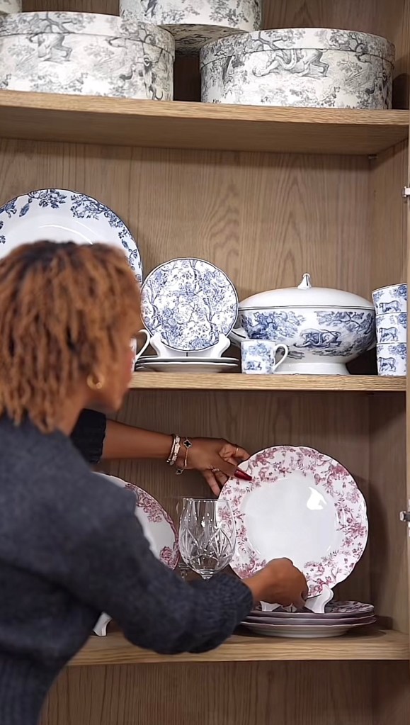 This is were we see that, she too, has a china cabinet where she keeps her fine dishes from brands such as Dior housed. It is not the dark mahogany or cherry wood many of us were used to seeing in our homes growing up, but a lighter finished wood that feels more contemporary and matches the neutral tones of her home decor.